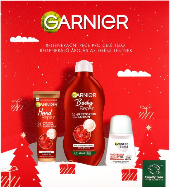 A Garnier karácsonyra egy átfogó testápolási ajándékcsomaggal segít meglepni a szeretteid. Prémium regeneráló csomagunk Magnesium Ultra Dry dezodort, intenzíven tápláló testápolót és regeneráló kézkrémet tartalmaz a bőr regenerálásáért a hideg téli időben. ​ Csomag tartalma: