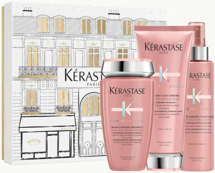 A festett haj ápolására kifejlesztett limitált kiadású Chroma Absolu színvédő hajfürdőt, hajerősítő balzsamot és hajformázó terméket tartalmazó ajándékcsomag.