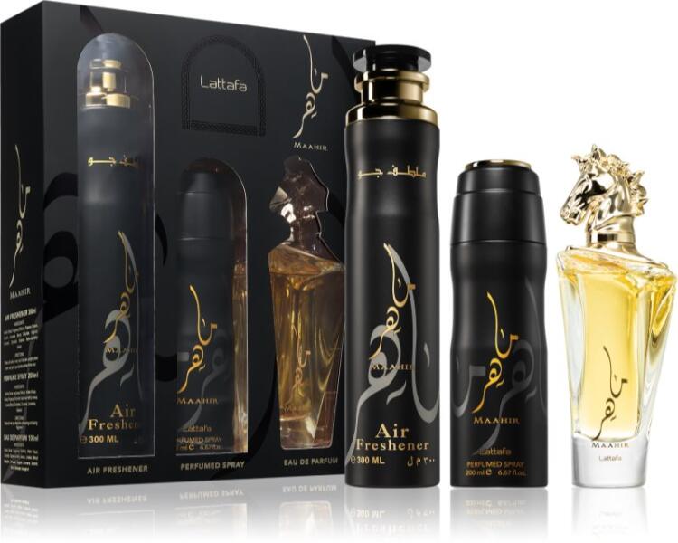 Lattafa Maahir, 1 db, Uniszex szettek unisex, A különleges alkalmak különleges ajándékokat kívánnak, akár magának, akár szeretteinek szeretne örömet szerezni. A Lattafa Maahir ajándékszett illatok és kozmetikai termékek olyan, gondosan kiválogatott és szeretettel összeállított kombinációját tartalmazza, amelyek garantáltan mosolyt varázsolnak az Ön vagy szerettei arcára, akár egyszerre veti bele magát a felfedezésükbe, akár fokozatosan nyitja ki őket a hónap folyamán. Tulajdonságok: ajándéknak kiváló A szett tartalma:Lattafa Maahir Eau de Parfum 100 ml dezodor illatosított 200 ml légfrissítő 300 ml