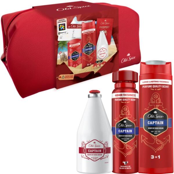 Old Spice Captain, , Férfi-testápolási szettek férfiaknak, Szerezzen örömöt a férfi testápoló készítményekkel teli Old SpiceCaptain kozmetikai készlettel. Minden külsejére adó modern férfi örül neki. A szett tartalma:Old Spice Captain fürdőgél férfiaknak 250 ml Old Spice Captain borotválkozás utáni arcvíz 100 ml Old Spice Captain izzadásgátló deo stift 50 ml kozmetikai táska 1 db Használata: A kozmetikai szett minden egyes termékét az adott termék útmutatója szerint használja.