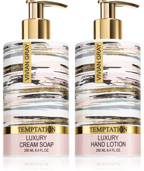 Vivian Gray Temptation, , Kozmetika szettek nőknek, Lepje meg magát vagy szeretteit kozmetikai szettel. A szett tartalma: Temptation krémes szappan kézre 250 ml testápoló tej kézre 250 ml Tulajdonságok: a bőr kezelésére és regenerálására eltávolítja a szennyeződéseket és a baktériumokat hatékonyan mossa a kezet ajándéknak kiváló Használata: A kozmetikai szett minden egyes termékét az adott termék útmutatója szerint használja.