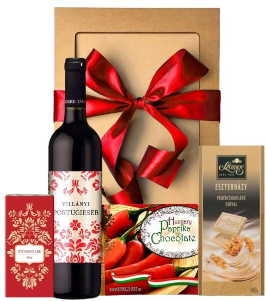 Szamos tejcsokoládé: klasszikus Szamos sütemény egy tábla csokoládéba rejtve, mely tökéletesen visszaadja a Szamos  torta ízét. Változó ízekben. ( Eszterházy, Isler, Mandula, Dobos torta) Kézműves grillázs: Paprikás diós grillázs különlegesség kakaóbab törettel. Magyaros kézműves csokoládé: Hazai kézműves csokoládé Gere Tamás Portugieser:  Magyaros csomagolásban a Villányi borvidékre jellemző lágy, gyümölcsös vörösbor.   Ajándékdoboz:  Díszdoboz dekorációs szalmával és masnival. A termékeket stílusosan elhelyezzük a dekorációs szalmában és szatén masnival zárjuk le a dobozt. A doboz méretét a benne lévő termékekhez választjuk. A kisebb dobozunk 36x22x9 cm a nagyobb pedig 39x28x10 cm-es. A díszdoboz önmagában nem vásárolható meg, csak termékekkel együtt árusítjuk. Kényeztesse szeretteit egy exkluzív hazai ajándékcsomaggal, amely a legmagasabb minőségű, magyar termelők által készített termékeket tartalmazza, így garantálva a felejthetetlen gasztronómiai élményt.