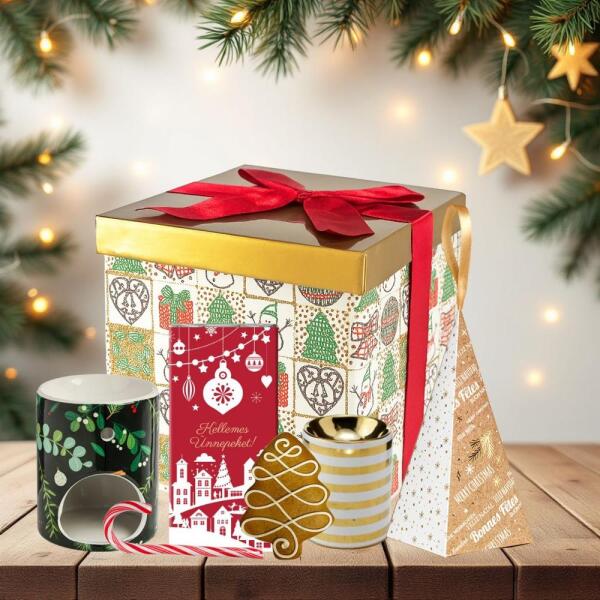 Aroma lámpa:  Porcelán aroma lámpa Karácsonyi kézműves csokoládé: Kézműves csokoládé, mely különleges hangulatú csomagolásával egyedivé teszi az ajándékcsomagot. Illatviasz : Kellemes illatú kézműves viasz. A megfelelő szellőztetésről mindíg gondoskodjon. Aroma lámpa:  Porcelán aroma lámpa  Kézműves mézeskalács: Elmaradhatatlan karácsonyi édesség mely dekorációs célra szolgál. Cukorpálca: Színes nyalóka. Ajándékdoboz: