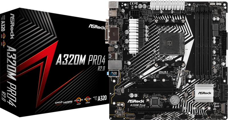 ASROCK A320M Pro4 R2.0 típusú alaplap Socket-AM4 foglalattal, AMD A320 chipsettel, Processzorban integrált videokártyával, 4 darab DDR4 memóriafoglalattal (max 64GB). 6 darab USB 2.0 port, 7 darab USB 3.0 port, darab USB 3.1 port.
