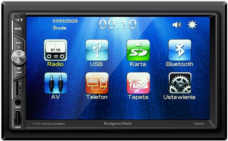 Rádió kijelzővelBővíteni szeretné autóaudio berendezését? A Kruger & Matz KM 2007 modell egy 2 DIN-es autórádió, amely 7 hüvelykes, állítható fényerejű érintőképernyővel lett felszerelve. Győződjön meg róla, milyen nagyszerűen fog kinézni az autójában. Hangszóró rendszerA Kruger & Matz KM 2007 egy Bluetooth-os autórádió, így okostelefonjáról is lejátszhatja a lejátszási listát. Sőt, a beépített mikrofonnak köszönhetően a KM 2007 felváltja a kihangosítót. 4x 40 W teljesítményA Kruger & Matz rádió maximum 4x 40 W teljesítménnyel fog játszani. Ezen kívül basszus és magas hangszínszabályzóval, valamint hangszínszabályzóval is rendelkezik, aminek köszönhetően a hangbeállításokat az éppen hallgatott zene típusának megfelelően állíthatja be. USB, AUX, SDA Kruger & Matz KM 2007 autórádió a lehetőségek széles skáláját kínálja a hang- és képforrás kiválasztásánál. A Bluetooth funkció mellett van egy UBS port, egy AUX aljzat és egy memóriakártya-olvasó. Tolatókamera kimenetA funkcionális autórádiónak sokkal többet kell kínálnia, mint a zenelejátszást, ezért van a KM 2007 modell elülső kamera kimenettel és tolatókamera kimenettel. Mindezt a biztonság növelése érdekében. Távirányítós rádióKi mondta, hogy a sofőr választja ki a zenét az autóban? A Kruger & Matz KM 2007 autórádió mellett a készlet tartalmaz egy távirányítót is, amellyel a hátsó ülésen ülő utasok kezelhetik a készüléket.
