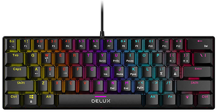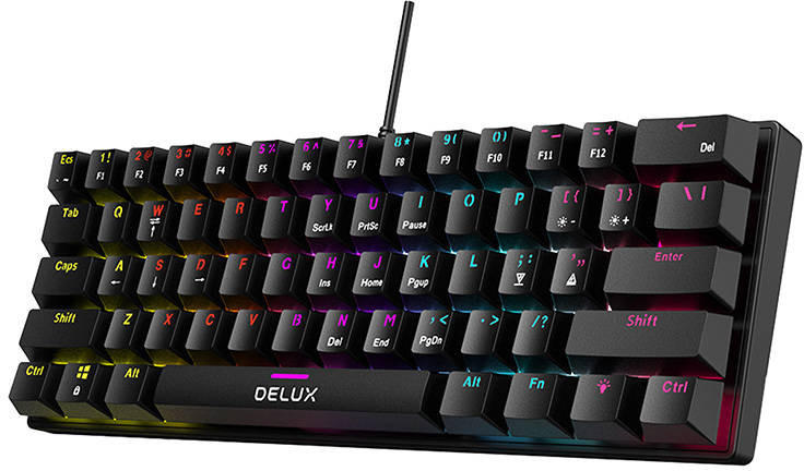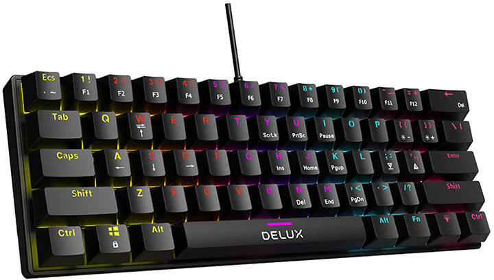 Delux KM36BU játék billentyűzet A Delux KM36BU játékbillentyűzet 61 billentyűből áll, így ideális kisebb helyekre.  Kék kapcsolókkal van felszerelve, és 12 háttérvilágítási módot kínál. Kompakt kialakítás A Delux billentyűzetet kompakt kialakítása jellemzi – 61 billentyűt tartalmaz, amelyek élettartama akár 20 millió kattintás is lehet.  Ennek eredményeként nem fog túl sok helyet foglalni.  Ezenkívül kék mechanikus kapcsolókkal van felszerelve, amelyeket hangos működés jellemez, és jól működnek gépeléshez és játékhoz. Színes háttérvilágítás A még nagyobb elmerülés érdekében a billentyűzetet színes háttérvilágítással látták el.  Testreszabhatja a KM36BU megjelenését, ha 12 háttérvilágítási mód közül választhat.  Ezzel az eszköz nagyszerű kiegészítője lesz a játékkészletnek. Műszaki leírás: