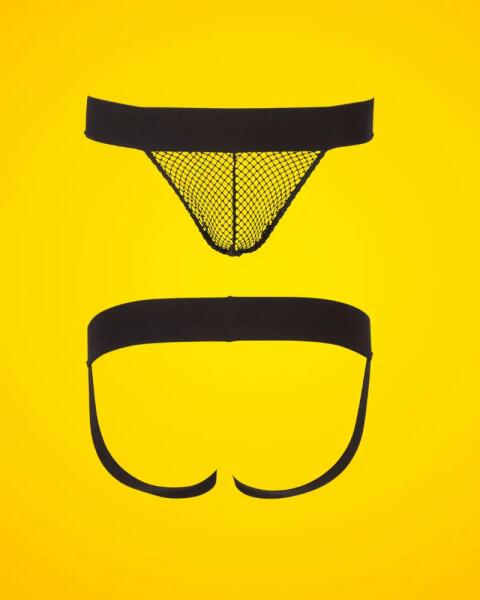 Extra szexi, teljes bepillantást engedő, különleges, egyedi szövésű, fekete neccből készült látvány-alsó, péniszemelő szabással, mely által minden tekintet biztosan a férfiasságra szegeződik. Extra széles, kényelmes, rugalmas derékpánttal. Hátul csupán két pánttal, így a popsi szabadon marad.