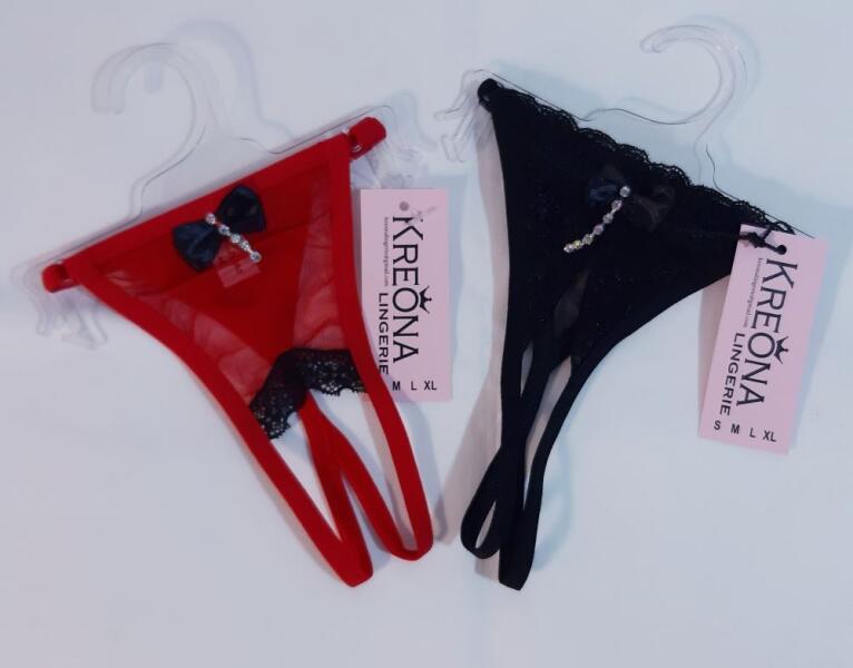 Elől nyitott tanga tüll anyagból, az elején masni meg strasszkő diszitéssel.