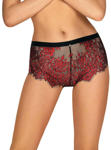 Alapvetően piros dominanciájú, de fekete cérnával kombinált anyagból készült alsó, felül szeténos, rugalmas pánttal, masnis dísztéssel. Szegélyein kicsit rojtos kivitelben az intim résznél diszkrét béléssel.