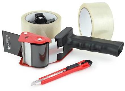 -az adagolóhoz 2 tekercs átlátszó csomagolószalag (50 mm x 50 m), és egy 9 mm-es, lepattintható univerzális kés is tartozik