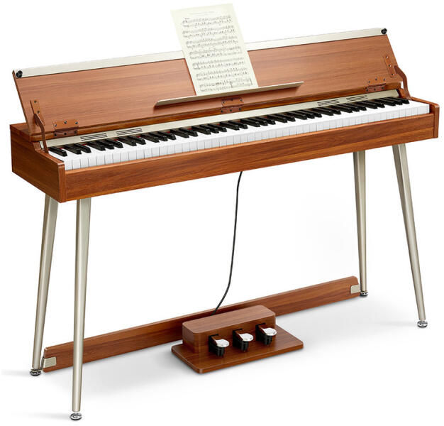 Donner DDP-80 Plus digitális zongora – elegáns dizájn, prémium részletek A Donner DDP-80 Plus nem csupán egy digitális hangszer, hanem egy stílusos, karakteres bútor és lakáskiegészítő is, amely harmonikusan illeszkedik bármely enteriőrbe. Letisztult vonalvezetését faerezetes burkolat , elegáns pezsgőarany lábak , valamint vésett radium fém díszítőelemek egészítik ki. A félig nyitott zongorafedél nemcsak esztétikai, hanem praktikus szerepet is betölt, halk záródást és porvédelmet biztosít. A DDP-80 Plus szívében egy 88 billentyűs, progresszív súlyozású kalapácsmechanikás billentyűzet található, amely valósághű játékélményt nyújt. A francia DREAM hanggenerátor és a beépített 2 × 20 W-os sztereó hangrendszer részletgazdag, autentikus zongorahangzást biztosít. Főbb jellemzők:
