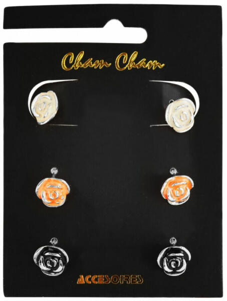 Rózsa motívumos többszínű fülbevaló szett. 3 pár.  Származási hely: Németország.  Márka: Cham Cham. Egy jól megválasztott ékszer öltöztet, feldobja a napodat, valahányszor ránézel, jobb kedvre derülsz. A színekkel és anyagokkal manapság könnyű variálni a különböző stílusokat, nem kell ragaszkodni a hagyományos szettekhez, nem feltétlenül kell a fülbevalót a karkötő vagy nyaklánc színéhez igazítani. Légy akár merész, akár konvencionális, nálunk biztosan megtalálod a megfelelő ékszert.