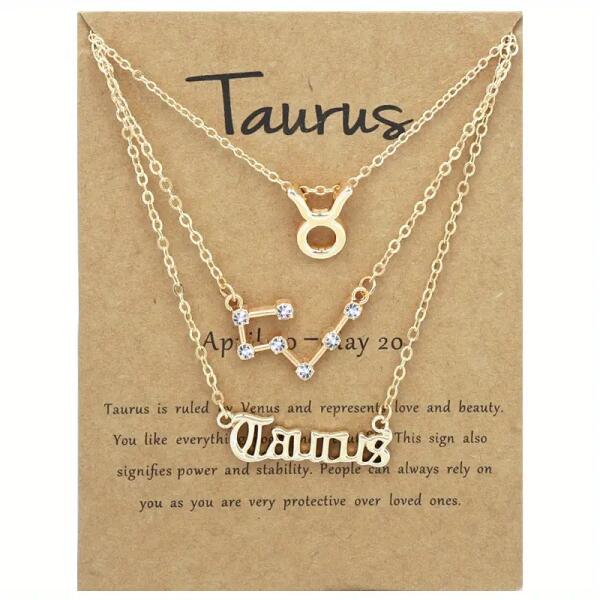 Elegáns, három darab, külön-külön viselhető nyakéket tartalmazó szett az Bika (Taurus) jegyében. Tartalmazza a horoszkóp szimbólumát, a csillagképet és a "Taurus" feliratot. Az arany színű nyakékek gyönyörűen kiegészítenek bármilyen outfitet, és nagyszerű ajándék a április 20. és május 20. között született nőknek.