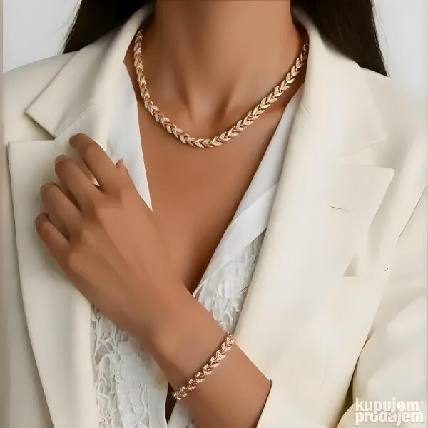 Elegáns ékszerszett, amely nyakláncból és karkötőből áll, rózsaarany színben, amely szofisztikált csillogást visz az öltözékébe.