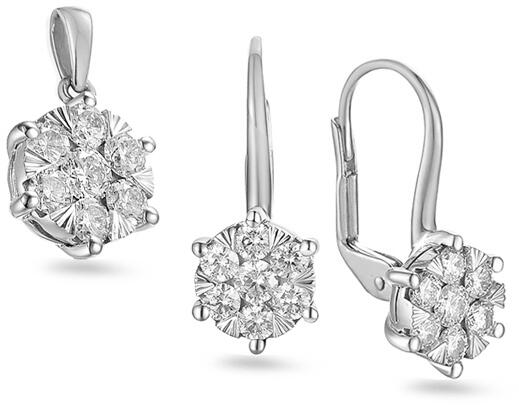 A fehérarany gyémánt szett fülbevalóból és medálból áll. Minden ékszert hét csillogó gyémánt díszít. A huszonegy gyémánt össztömege 1540 karát, H színű és SI1 tisztaságú. A gyémántok iZlato® hitelességi tanúsítvánnyal rendelkeznek.