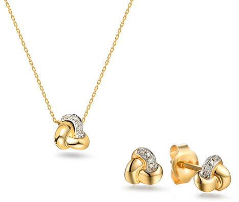 A szerencsés csomó alakú díszítésekkel ellátott kivételes készlet bájt, kegyelmet és eleganciát kölcsönöz Önnek. Fülbevalóból és nyakláncból áll. A sárgaarany árnyalatokat összesen hét gyémánt csillogása világítja meg, amelyek összsúlya 0,020 ct, színe H, tisztasága SI1. A fülbevaló csokorcsattal záródik. A nyakláncon használt zár egy tollkarika. A medál 6,5 mm széles és 6,3 mm magas.