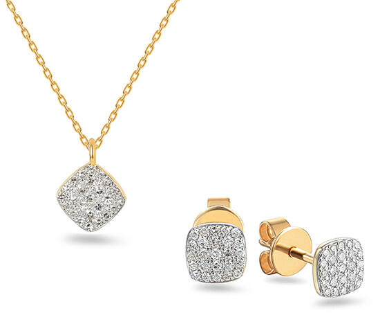 Ez a minimalista sárgaarany szett tökéletes példája az egyszerűségben rejlő eleganciának. A nyakláncot és a fülbevalót egy finom négyzet alakú díszítés díszíti, amelybe csillogó, briliáns csiszolású gyémántok vannak berakva, összesen 0,190 ct tömeggel. Ez a szett ideális a minimalista stílushoz értő, de egy kis luxusra is vágyó nők számára. A négyzet alakú medál sokoldalú dizájn, amely könnyen kombinálható a legkülönbözőbb öltözetekkel, és alkalmas a mindennapi viselethez, de olyan különleges alkalmakra is, amikor egy finom, mégis figyelemfelkeltő kiegészítőre van szükség. A fülbevaló masnis rögzítése biztonságos és kényelmes illeszkedést biztosít.