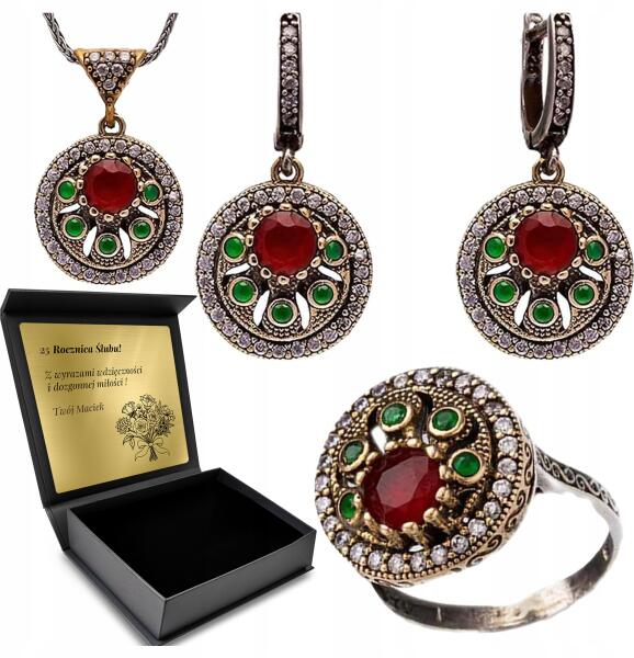 Ottomania Ezüst Ékszer Szett 925 Cirkónia Rubin Smaragd Gravírozás Ajándék (kpl-036_19r)ALLEGRO