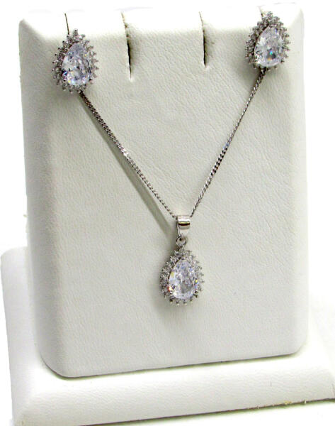 Ezüst szett neked! Készleten, azonnal szállítható! Gyönyörű és látványos 925-ös finomságú ezüst ékszer szett. Ródiummal bevont, hogy jobban ellenáljon a környezeti hatásoknak és sokáig megőrizze az ezüst fényét. Nyaklánc 45 cm medállal és bedugós fülbevalóval egyben. A medál és a fülbevaló köve 12 mm, cirkóniával díszített. Kitűnő ajándék ünnepekre, úgy mint születésnap, névnap, ballagás.