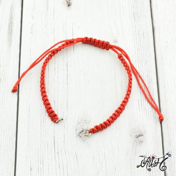 Piros színű selyemfényű zsinórból fonott kész karkötő alap, melynek középső két végein platina színű 5-7 mm méretű szerelőkarika található, aminek segítségével a karkötő tovább díszíthető, építhető. Mérete állítható a csúszó csomónak köszönhetően.
