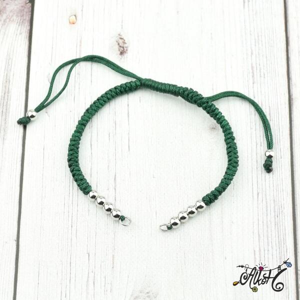 Smaragdzöld színű selyemfényű zsinórból fonott kész karkötő alap, melynek középső két végein platina színű gyöngy köztes díszek találhatók. A végekre platina színű 4 mm méretű szerelőkarikák vannak szerelve, amiknek segítségével a karkötő tovább díszíthető, építhető. Mérete állítható a csúszó csomónak köszönhetően.