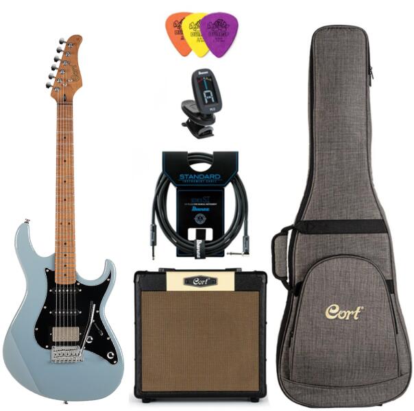 Összeállítottunk egy olyan szettet, amely tartalmazza a gitárt és a hozzátartozó alapvető kiegészítőket annak aki gitározni szeretne!Mint minden nálunk vásárolt gitár a Te gitárod is teljesen beállítva hagyja el a boltot, melynek köszönhetően könnyedén és kényelmesen tudsz majd játszani rajta. A szett tartalmaz:- egy Cort G250SE elektromos gitárt- egy párnázott Cort puhatokot a biztonságos szállítás érdekében- egy hangológépet, hogy mindig hangolásban legyél- 3 darab különböző pengetőt a különféle játékmódokhoz- egy Cort CM15R (15W) gitárkombót, hogy hallhasd milyen riffeket játszol- egy 3m hosszú zajmentes gitárkábeltGitár specifikáció:Konstrukció: csavarozott nyakTest: amerikai hársfaNyak: égetett juharMenzúra: 25.5" (648 mm)Fogólap: égetett juharRádiusz: 240 mmFelső nyereg: 42 mmBundok: 22Hangszedő: Cort® Voiced Tone VTS63 & VTH59Elektronika: hangerő, hangszín (Coil-Tap), 5-állású kapcsolóHardver: krómHíd: kétpontos tremolo, hajlított acél nyereggelKulcs: Die-castBerakás: fekete pontokHúrok: D'Addario® EXL120