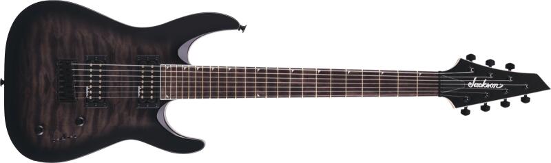Termékleírás A JS Series Dinky® Arch Top JS22Q-7 DKA HT tökéletes választás a hét húros gitárok rajongói számára, akik stílusos és megfizethető hangszerre vágynak. Az 26.5 hüvelykes skálahossz javítja az alacsony frekvenciák artikulációját, míg a könnyű és rezonáló nyárfa test, valamint a rétegelt juhar ívelt teteje stabilitást és kiváló zenei teljesítményt kínál. A bolt-on juhar nyak grafit megerősítéssel van ellátva, amely biztosítja a hosszú távú megbízhatóságot. A 12"-16" compound radius amaranth fogólap 24 jumbo bunddal és gyönyörű gyöngyház beépített inakkal kiváló játékélményt nyújt, lehetővé téve a vastag riffek és gyors szólók feszültség nélküli megvalósítását. A JS22Q-7 DKA HT két Jackson® High-Output 7-húros hangszedőt használ, háromállású kapcsolóval, valamint külön volumen- és hangerőszabályzóval felszerelve. Az állandó Jackson HT7 híd lehetővé teszi a tökéletes hangzást és stabili hangeszközi teljesítményt. Ez a fantasztikus hét húros gitár a hátborzongató Transparent Black Burst bevonattal és fekete hardverrel készült, felkészülve arra, hogy megjelenítse zenei tehetségét. Specifikációk