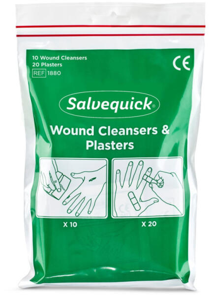 Steril, nedves sebtisztító kendők és rugalmas sebtapaszok praktikus kis csomagban. A sebtisztító kendő segítségével a karcolások, vágások által keletkezett sebek azonnal kitisztíthatók, majd sebtapasszal leragaszthatóak. A sebtisztító kendőnek köszönhetően nincs szükség vattára és fertőtlenítőszeres flakonokra. Egy készlet 20 Salvequick sebtapaszt és 10 Salvequick sebtisztító kendőt tartalmaz. Eltarthatóság: 5 év.