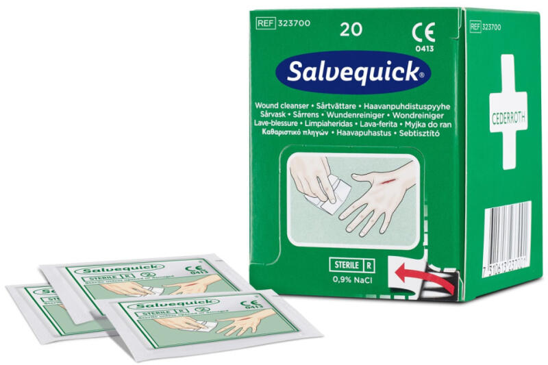 A doboz 20 db külön csomagolt, karcolások, vágások által keletkezett sebek tisztítására alkalmas törlőkendőt tartalmaz. A Salvequick sebtisztító kendőnek köszönhetően nincs szükség vattára és fertőtlenítőszeres flakonokra. Steril fiziológiás sóoldattal átitva, egyenként csomagolva. Cederroth elsősegély-állomás utántöltéséhez is alkalmas. A kendők mérete 100 x 140 mm. IIa osztályú orvostechnikai eszköz.