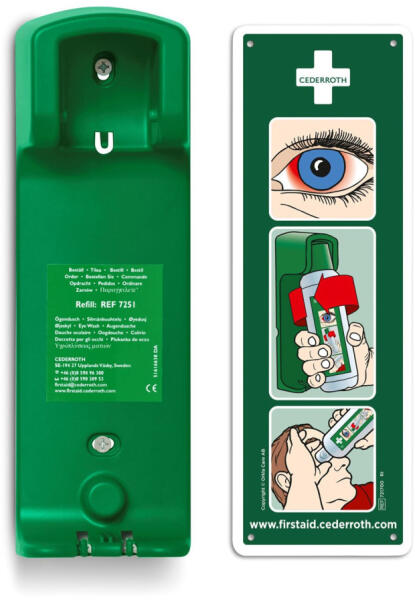 Kemény, zöld műanyagból készült robusztus és praktikus fali tartó Cederroth szemkimosó palakhoz. A fali tartó fix helyet biztosít a flakon számára, így vészhelyzetben könnyen megtalálható. A palack automatikusan kinyílik a tartóból való kicsavaráskor, lehetővé téve az azonnali öblítést. A tartó bármilyen függőleges felületre felszerelhető, pl. falra, járműre, laboratóriumi asztalra vagy akár a Cederroth elsősegélynyújtó táblára is. Fluoreszkáló használati utasítás táblával ellátva.