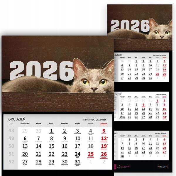 Háromrészes naptár 2026 Irodai év Függő Fali Bájos Macska Minták (Kalendarz 2026 RokUroczy Kot Wz)ALLEGRO