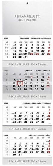 4 tömbből álló 4 havi speditőr falinaptár. A naptár teljes mérete: 315x1065 mm. Reklámfelület: fejkarton: 315x213 mm, tömbök között: 300x35 mm.