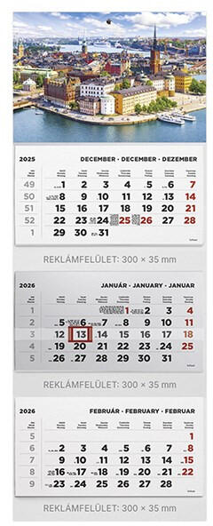 3 tömbből álló 3 havi speditőr falinaptár. A naptár kerekített mérete: 315x852 mm Reklámfelület: fejkarton: 315x213 mm, tömbök között: 300x35 mm.