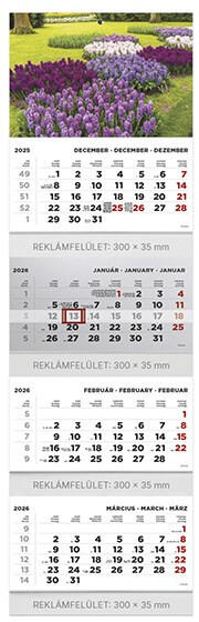 4 tömbből álló 4 havi speditőr falinaptár. A naptár teljes mérete: 315x1065 mm. Reklámfelület: fejkarton: 315x213 mm, tömbök között: 300x35 mm.