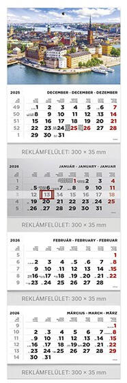 4 tömbből álló 4 havi speditőr falinaptár. A naptár teljes mérete: 315x1065 mm. Reklámfelület: fejkarton: 315x213 mm, tömbök között: 300x35 mm.
