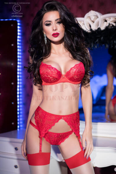 Puha piros csipkéből megálmodott három részes fehérnemű szett a Chilirose cégtől. Merevítővel készült csipkmelltartó, állítható harisnyakötő és rugalmas alsó együttese minőségi anyagból. Chilirose fehérnemű elegáns dobozba csomagolva.