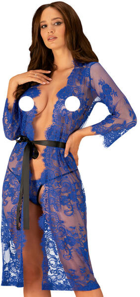 Áttetsző, könnyed, virágmintás anyagból készült köntös, szegélyein "tépett" hatást keltő megoldással, szaténszalagos derékpánttal. A képen látható tanga nem tartozék.