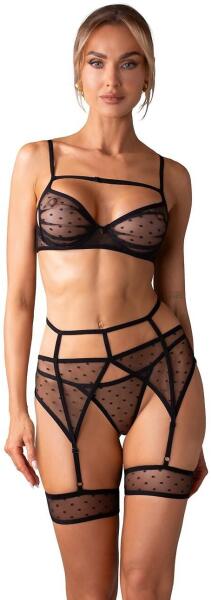 Fehérnemű szett, melltartó, tanga és harisnyakötő öv - átlátszó hálóból készült - kis borsó minta - huzalos csészék - gumival díszített nyakkivágás - derékban gumírozott harisnyakötő öv - akasztós és szemes záródás hátul - alacsony derekú tangát tartalmaz - állítható nadrágtartó Összetétel: 85% poliamid, 15% elasztán
