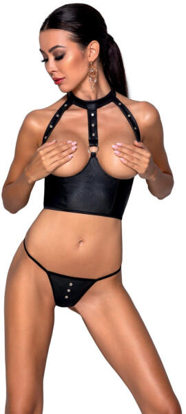 Ez a 2 darabos szett tartalmaz egy nyaknál galléros felsőt, nyitott kosarakkal, valamint hozzá illő, szexi tangát. A szett több pánttal és ezüst részletekkel rendelkezik, és kényelmes viselet.