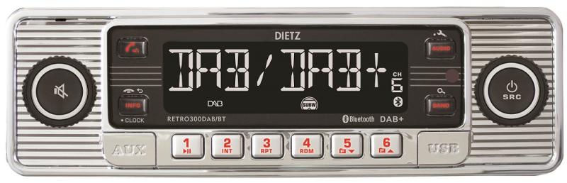 A Retro300DAB rádió a legújabb technológiát kínálja retro megjelenésű házba csomagolva. Ideális klasszikus, vagy Oldtimer autókba, illetve azok számára, akik kedvelik ezt a stílust. A Dietz Rerto 300DAB rádiós fejegység minden olyan szolgáltatással rendelkezik, amit a mai technológia és a fogasztói igények elvárnak. Előre programozott hangszínszabályzók, 4 hangszórókimenet, csatornánként MOSFET erősítő által biztosított 50 W maximális teljesítménnyel. A gyártó azokra is gondolt, akik jobb hangminőségre, vagy nagyobb teljesítményre vágynak. Az öt előerősített kimenet (4 szélessávú + 1 subwoofer) szinte az összes konfigurációhoz elegendő. A rádióállomások és beállítások tárolása, infravörös távvezérlő, és automatikus kikapcsolás teszi fel az i-re a pontot. A telepítés is nagyon egyszerű: ISO csatlakozók, a szabvány 1 DIN méret és DIN antenna csatlakozás mind a beszerelést és az univerzális alkalmazást egyszerűsítik le. A kiváló minőségű DAB+ digitális rádióvevő lehetővé teszi, hogy háttérzaj nélkül hallgathassa kedvenc adóját. Az állomások neve mellett a kijelző sok információt jelenít meg a programokról és a műsorszámokról. A legújabb memóriachip technológiának köszönhetően egyetlen mentett adó sem veszik el, ha a jármű akkumulátora lemerül, vagy eltávolítják azt. A Bluetooth funkció magában foglalja a telefon kihangosító rendszert, ami a csomagolásban található külső-, vagy a készülék előlapjába épített mikrofonnal egyaránt használhazó. A zenefájlok a Bluetooth audio funkcióval játszhatók le, az aktuális dal adatait megjelenítve a kijelzőn. Az előlapon található USB porton lejétszhatja kedvenc zenéit USB pendrájvról MP3, vagy WMA formátumban, vagy akár 1000 mA-rel is töltheti okostelefonját, miközben zenét játszik le Bluetooth adón keresztül. Az FM rádión könnyedén megtalálhatja kedvenc állomásait, mivelakár 18 műsorszolgáltató frekvenciája menthető el.