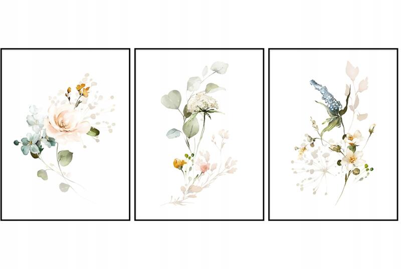 Grafika virágok növények 3db 21x29, 7cm A4 kép szett Keretben triptichon (kwiaty grafiki rośliny zestaw obrazów)