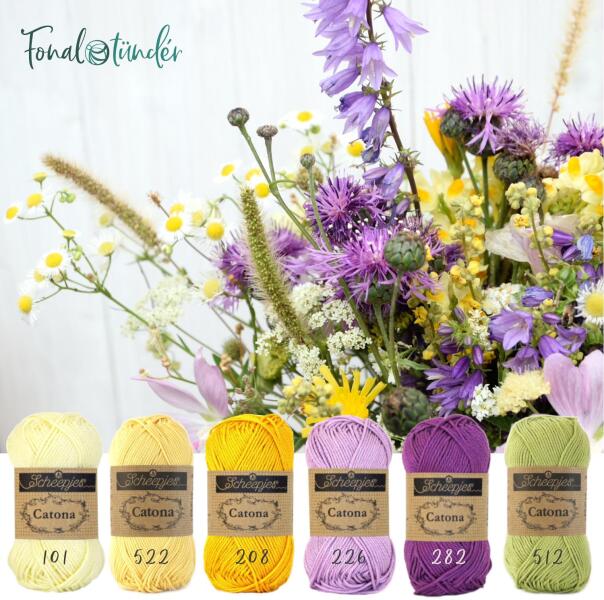 A "Citrom-Lila Vadvirág" fonal+eszköz csomag tartalma: < ul>