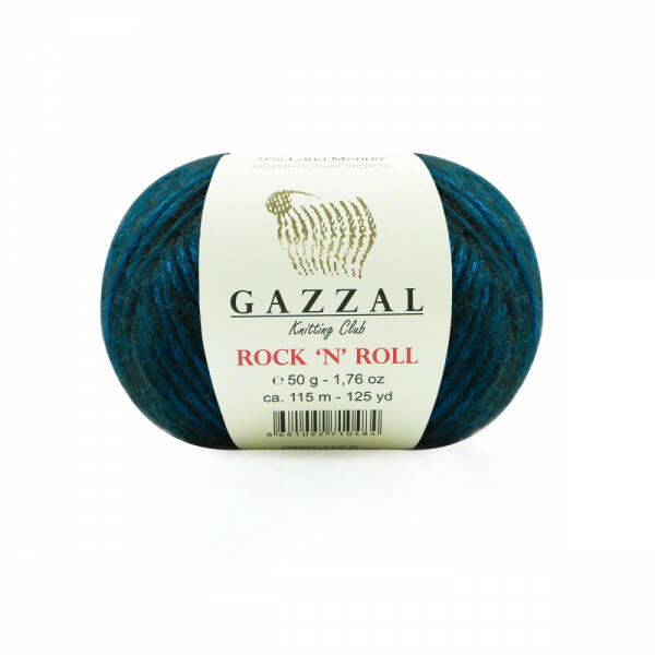 Gazzal Rock'N'Roll egy poliamiddal, akrillal és merinó gyapjúval kevert fonal: 21% akril, 70% poliamid, 9% merinó gyapjú. Ennek a fonalnak a lapos és enyhén szőrös textúra és a fémes fény exkluzív megjelenést kölcsönöz. A Rock'n'roll előnye az összetétele, aminek köszönhetően nincs viszkető érzet. A fényes poliamid szál lehetővé teszi, hogy érdekes hatást keltsen a kész anyagon. Nagyon puha tapintású és szépen csúszik a tűkön kötés vagy horgolás közben. Meleg, selymes, minőségi fonal. Nagyszerűen használható olyan elegáns kiegészítőkhöz, mint a kendő, táska, pulóver, sapka stb. Színpompa tipp: Férfi pulóver vagy sapka is készülhet belőle.