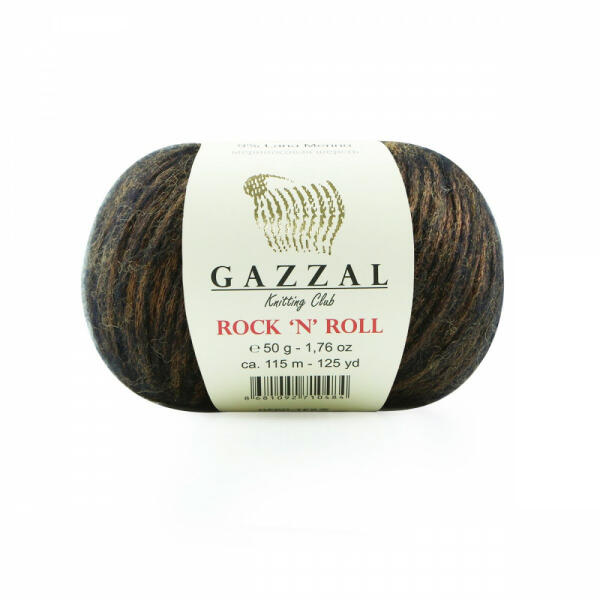 Gazzal Rock'N'Roll egy poliamiddal, akrillal és merinó gyapjúval kevert fonal: 21% akril, 70% poliamid, 9% merinó gyapjú. Ennek a fonalnak a lapos és enyhén szőrös textúra és a fémes fény exkluzív megjelenést kölcsönöz. A Rock'n'roll előnye az összetétele, aminek köszönhetően nincs viszkető érzet. A fényes poliamid szál lehetővé teszi, hogy érdekes hatást keltsen a kész anyagon. Nagyon puha tapintású és szépen csúszik a tűkön kötés vagy horgolás közben. Meleg, selymes, minőségi fonal. Nagyszerűen használható olyan elegáns kiegészítőkhöz, mint a kendő, táska, pulóver, sapka stb. Színpompa tipp: Férfi pulóver vagy sapka is készülhet belőle.
