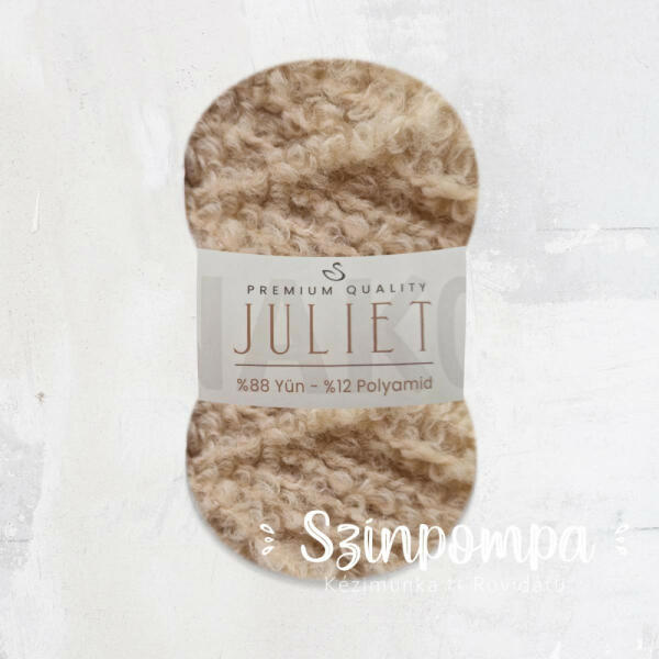 A Nako Juliet fonala egy buklé fonal. Különlegességét a speciális sodrási technika által a fonalon keletkező csomószerű kis hurkok adják, így lesz ilyen érdekes textúrája a szálnak. 88% gyapjútartalmának köszönhetően igazi őszi-téli fonal. Minden tulajdonsággal rendelkezik, ami a gyapjúra jellemző, például jól tartja a meleget, ami télen nagyon jó, ha fázunk. Poncsó, kardigán, mellény, de akár egy gyönyörű díszpárna is köthető, horgolható belőle. Ha gyakran varrsz, vagy horgolsz figurákat, jó választás, ha a hajának buklé fonalat választasz. Igazán különleges lesz az elkészített szőke, ősz, vagy barna frizura. OEKO-Tex Standard 100 minősítéssel rendelkezik, ami azt jelenti, hogy 100%-ban bőrbarát és semmilyen egészségre ártalmas anyagot nem tartalmaz. Színpompa tipp : Szuper választás mackóbundának, vagy bárányszőrnek!