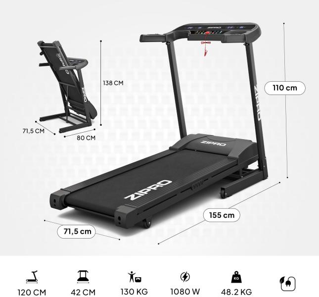 Modell Pulse, Felhasználás Otthoni, Ellenállási rendszer Elektromos, Motor teljesítménye 1,5 LE, Maximális sebesség 12 km/h, Maximális felhasználói súly 130 kg, Edzésprogramok Igen, Műszaki információk, Dőlésszög állítás Igen, Funkciók Időmérés, Távolságmérés, Sebességmérés, Pulzusmérés, Kalóriafelhasználás mérés, Szállítóventilátor Nem, Együttműködés mobil eszközökkel Nem, Bluetooth Nem, Wi-Fi Nem, Fizikai jellemzők, Pánt hossza 120 cm, Pánt szélessége 42 cm, Összecsukható Igen, Mini Jack csatlakozó Nem, USB csatlakozó Nem, Kijelző Igen, Bidontartó Nem, Tartó eszközök mobilokhoz Igen, Szálító kerekek Igen, Súly 48 kg
