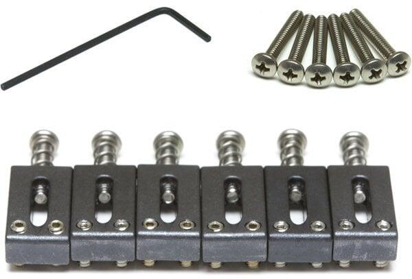 pótalkatrész: húrláb tüskék ST és T típusú gitárhoz, a csomag 6 db acél tüskét tartalmaz csavarral és rugóval, imbusz kulcs, 6 db csavar a rögzítéshez, a tüskék szélessége az E húrtól az e-ig: 52,73 mm, magassága: 5,84 mm, szélessége: 10,41 mm, hossza: 20,7 mm, fekete szín