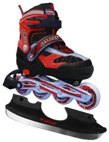 Univerzális korcsolya Spartan 2 az 1-ben, téli-nyári korcsolya, cserélhető vázszerkezettel. A korcsolyán egyszerűen átcserélhetünk korcsolyapengéről kerekekre. A Spartan 2 az 1-ben korcsolyát könnyű felcsatolni, fűzővel ellátott, emellett MicroLock biztonsági csattal is fel lett szerelve.  Nem kevésbé fontos előnyének számít a lecsatolható hátsó jobb fék és az ABEC 7 csapágyak.