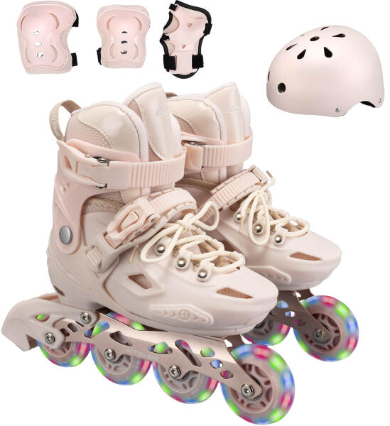 Action One Pastel Tan Görkorcsolya szett, sisakkal, könyök/térd védő és hordtáskával, állítható, S méret (28-31), barna Ez a készlet kezdő vagy haladó görkorcsolyázók számára készült, hogy teljes biztonságban korcsolyázhassanak. A készlet tartalma: állítható görgők, védősisak, könyök- és térdvédők, mindezt hordtáskában. A görgők több méretben állíthatók, nagyon ellenálló jéggel és puha és kényelmes béléssel rendelkeznek. Helyesen és szilárdan van rögzítve a bokára, így biztosítva a láb optimális védelmét. A sisak ultrakönnyű külső héja polipropilénből, belső anyaga EPS hab az ütési energia elnyelésére és 6 szellőzőnyílás. A csuklóvédő készlet tartós műanyagból és hálós anyagból készült. Jellemzők: Kerékátmérő: 64 mm, szilikon. Világító kerekek. Csapágyak: ABEC-7 Sín anyaga: alumínium Henger anyaga: polipropilén és háló Zárórendszer: állítható csat az optimális bokatartásért, csipke és tépőzár az optimális tartásért Fékvezérlés: klasszikus fék PP betéttel az egyik csomagtartón (jobbra)