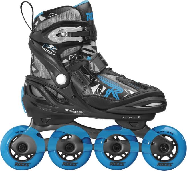 A Roces Moody TIF korcsolyákkal az első görkoris élmény tökéletes lesz gyermeke számára. A kényelmes és komfortos cipő továbbá tartós és hosszú ideig használható. A cipő mechanizmusának köszönhetően akár 5 méreten át is kitart és mindig alkalmazkodik a csemete lábához.   A minőségi alkotóelemek garantálják, hogy a gyerek mindig jól szórakozzon korizáskor.  "Láthatatlan keréksín" a széthúzható korcsolyán- király dizájn  az egyedi Roces keréksínnek köszönhetően, amelyet a kerekek színére festettek- alumínium keret és anatómiai kialakítású talpbetét, gyermeke minden elrugaszkodással újabb sebességet vesz fel- A korcsolya a gyermekkel együtt nő a széthúzható cipőnek köszönhetően